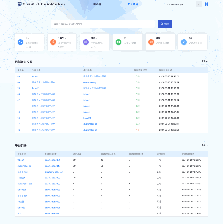 - 首页展示整个主子链网的数据概览,包括跨链交易“最短/长/平均完成时间“、”已接入子链数“和“总同步区块数”等数据