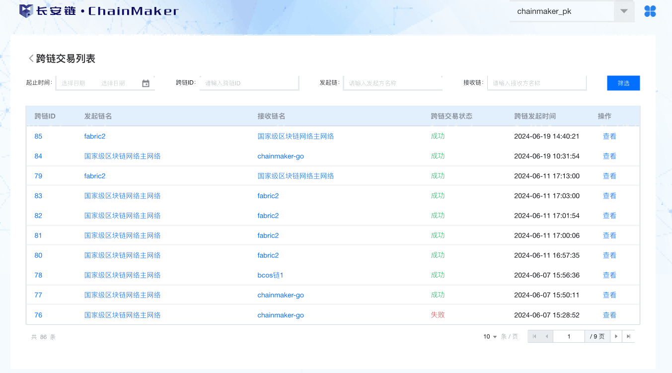 | 跨链交易列表 | 查看跨链ID、发起链、接收链、跨链交易状态和时间等 | |