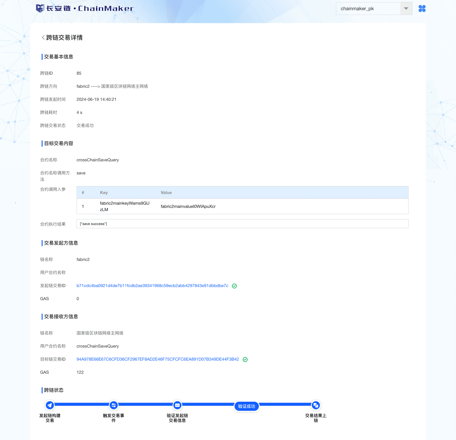 | 跨链交易详情 | 跨链方向、合约名称、合约执行结果、发起/接收链名称、交易ID、GAS、跨链状态等 | |