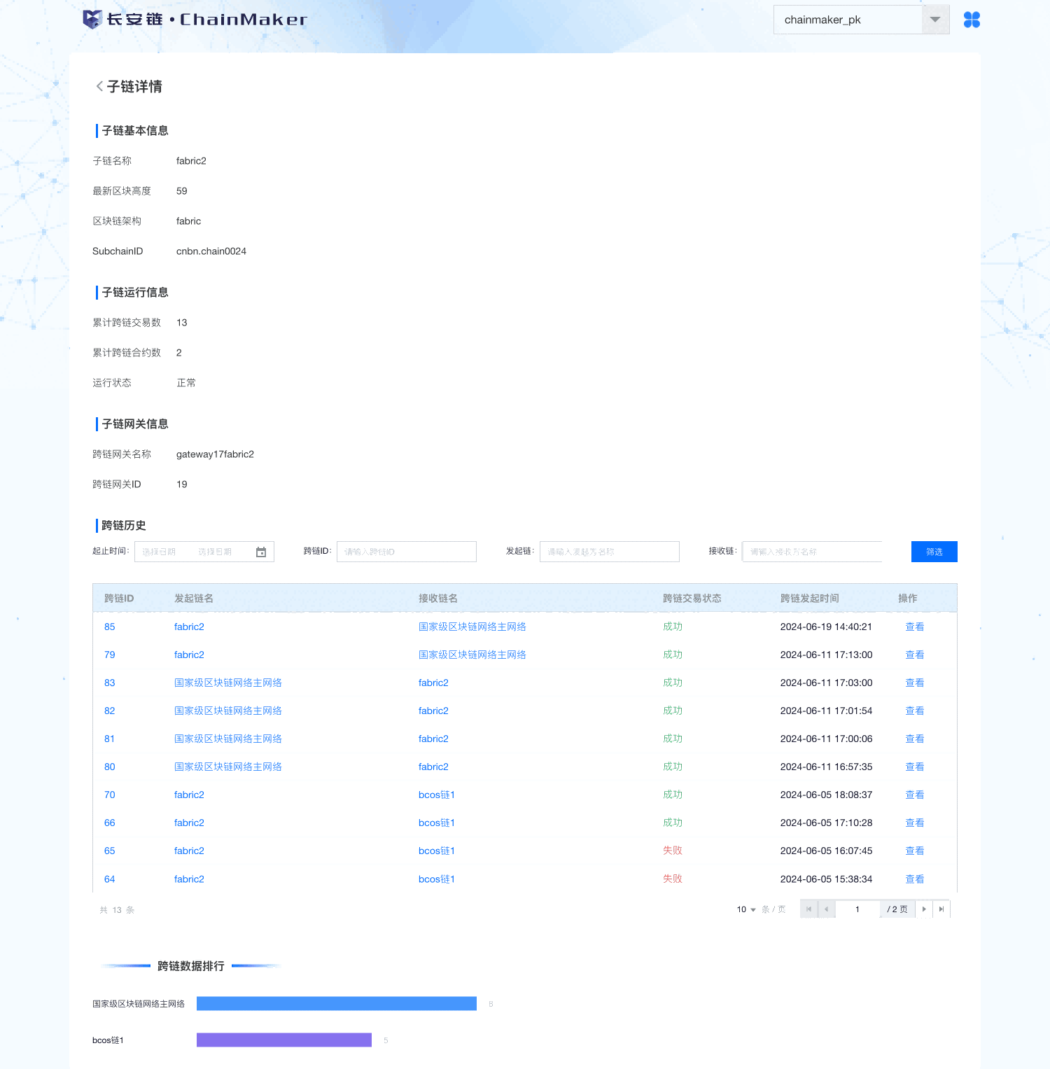 | 子链详情 | 子链名称、区块链架构、累计跨链交易数/合约数、运行状态、跨链网关名称、跨链网关ID、跨链历史、跨链数据排行等 |