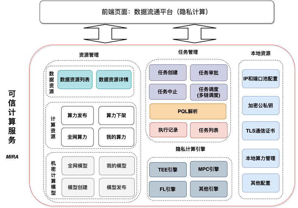 可信计算服务是数据要素流通平台的核心服务之一,主要负责资源管理、任务管理、本地资源配置等功能。可信计算服务简称MIRA。