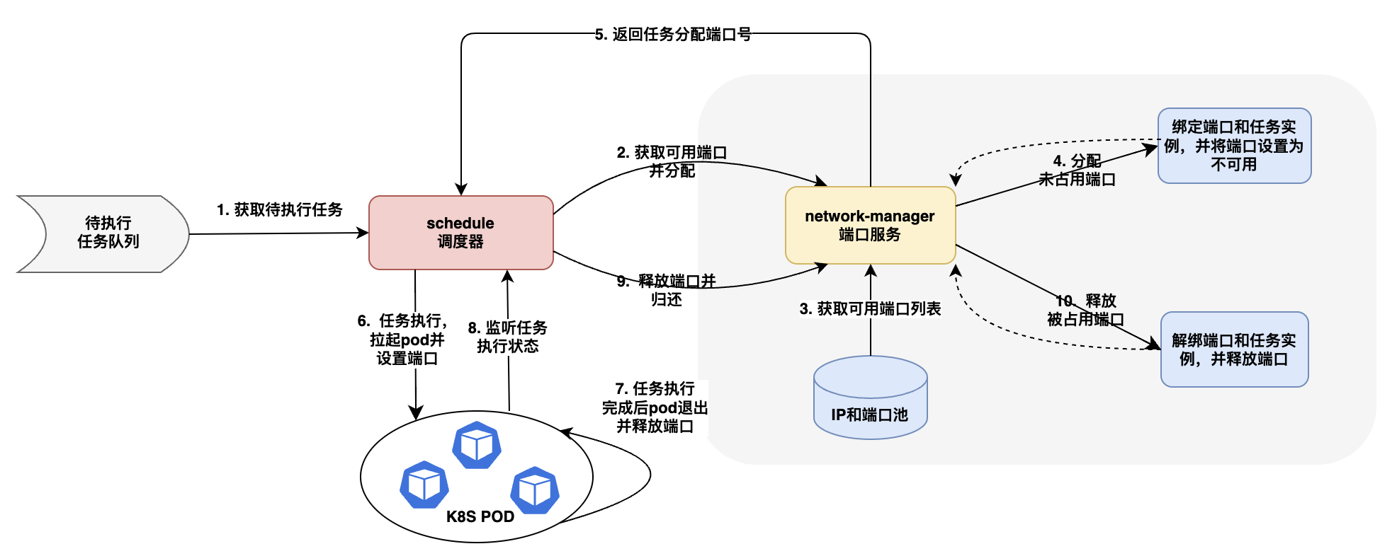 端口管理服务为在scheduler中收到的任务分配k8s执行端口,需要在端口池配置中指定端口范围是30000-32767中的一个端口段。如果用户创建的是单次任务、批次任务或者周期任务,则调度不会指定固定的端口号,随机为任务从端口池中分配一个端口,如果是流式任务,则申请一个指定的端口。schedule调度服务会一直监听任务使用情况,如果任务执行完成,则调用端口服务更新端口使用状态,释放端口。 对于单次、批次和周期任务,具体的端口调度流程如下图所示: