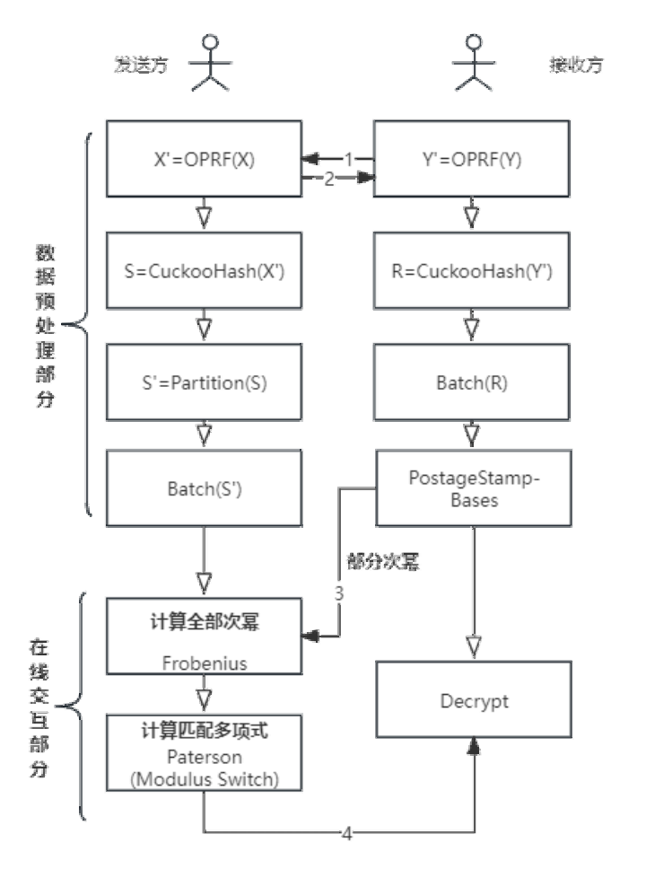 2. 在线交互部分 <br/>1) 接收方(Receiver)将预计算的部分次幂加密,发送给发送方;<br/>2) 发送方(Sender)先利用弗罗贝纽斯技术(Frobenius operation)同态计算出发送者数据的全部次幂,然后利用佩特森算法(Paterson Stockmeyer algorithm)计算求交多项式,若计算结果较大,则使用模交换(Modulus Switch)降低密文大小,最后返回给接收方;<br/>3) 接收方(Receiver)对收到的信息解密,通过部分解密结果是否为0判断是否是交集元素,如果是则解密另一部分内容得到查询结果。