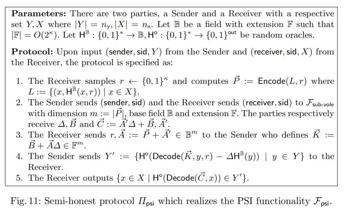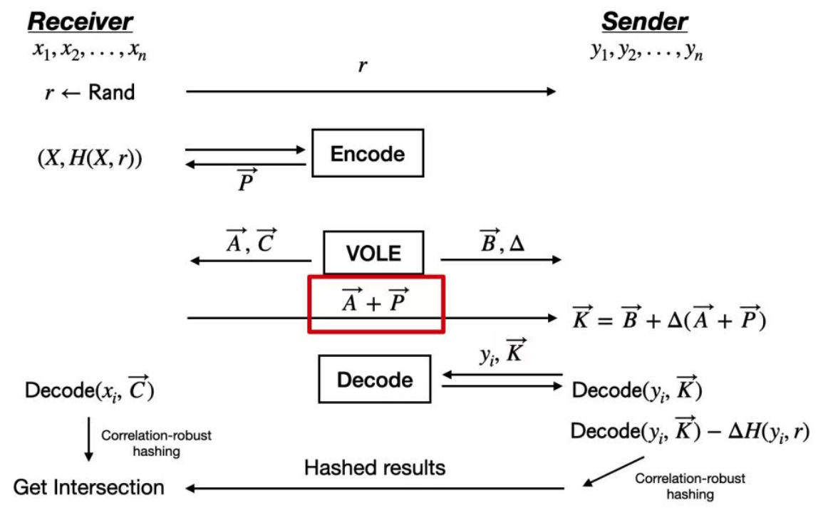 协议使用OKVS以及VOLE构建OPRF,再使用OPRF构建两方PSI。