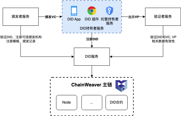 ChainWeaver DID基于W3C的DID Core标准和VC数据模型标准扩展而成,整体角色和信息流架构如图: