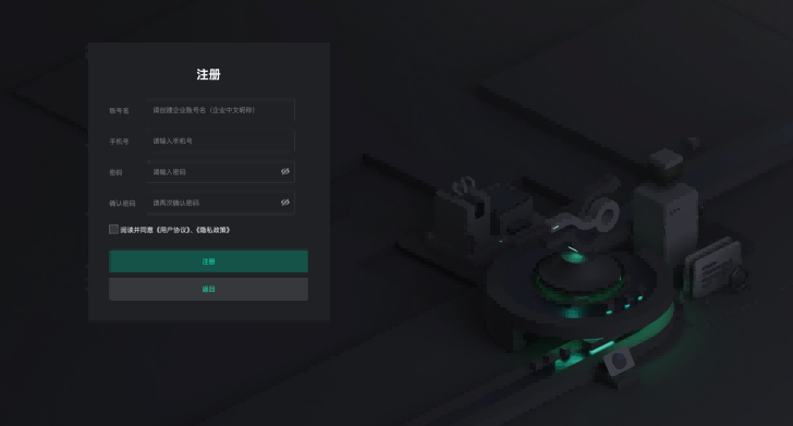 | 管理台账户管理 | 账户注册 | 注册企业账户 | 企业创建企业账号名及密码、录入主管理员手机号,完成企业账户注册 |