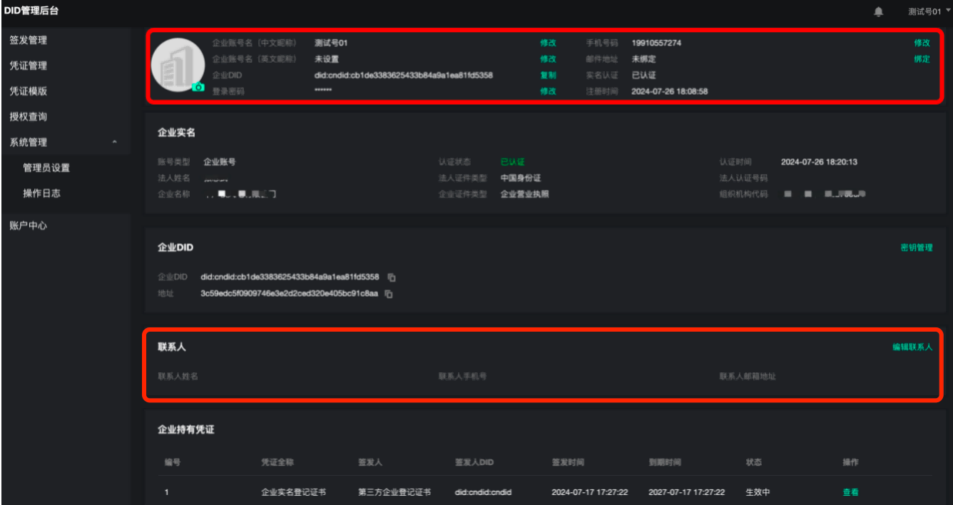 已实名DID用户的“账户中心”共包括5个子模块,分别为“账号基本信息编辑”“企业实名信息查询”“企业DID信息查询与密钥管理”“联系人信息编辑”“企业持有凭证查询”。