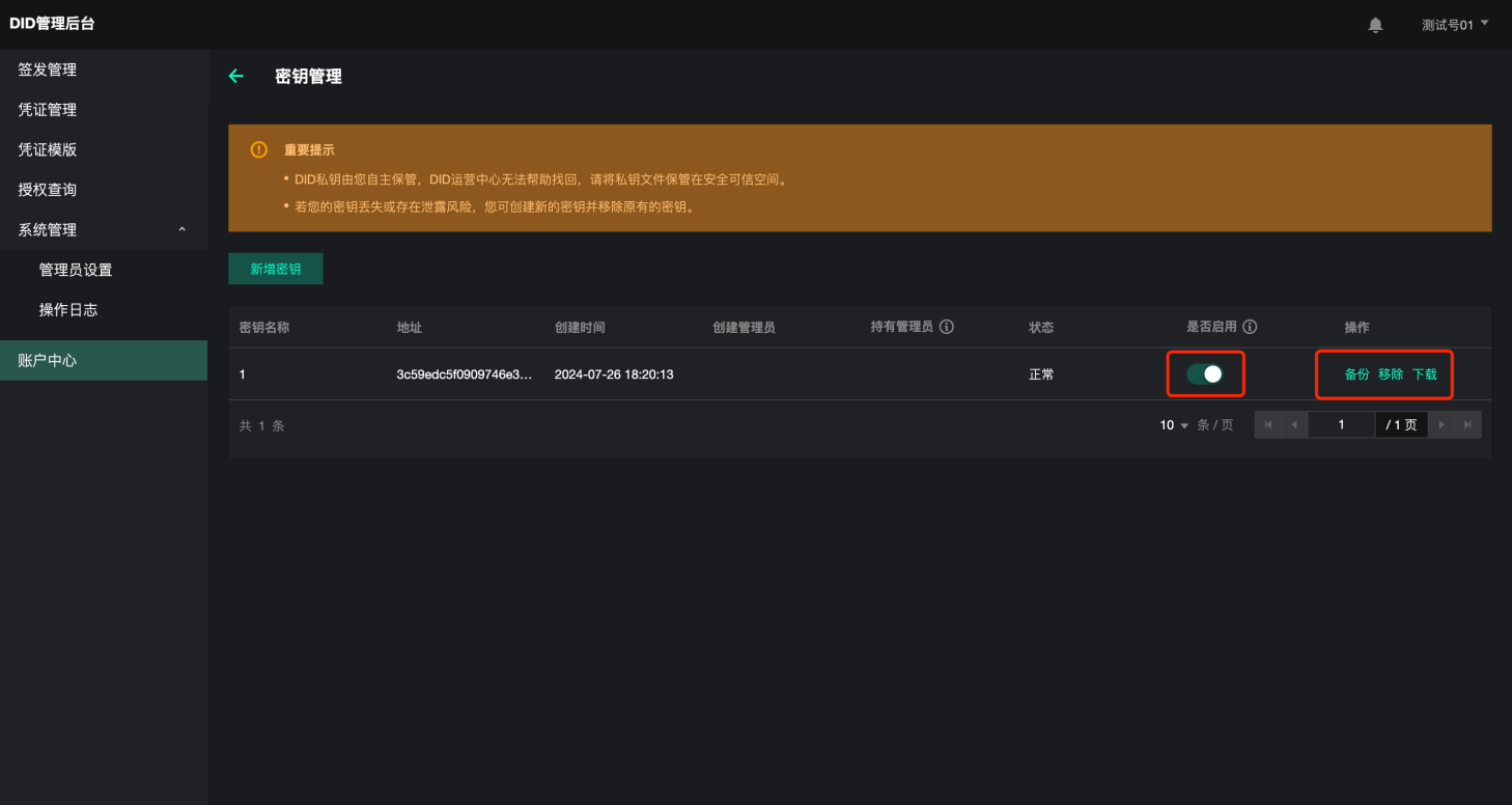 用户在账户中心-企业DID可查看、复制DID及链地址并进行“密钥管理”。