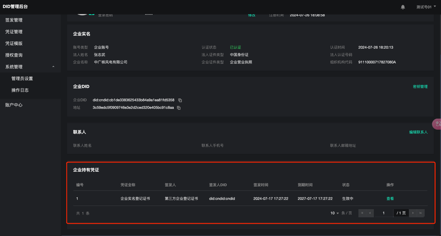 在“企业持有凭证”列表中,用户可查看自己企业名下持有的VC凭证,并查看凭证详情。
