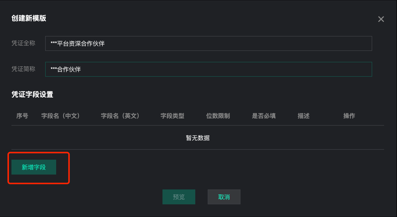 用户编辑完所有字段后,点击「预览」,可预览查看凭证模板详情。