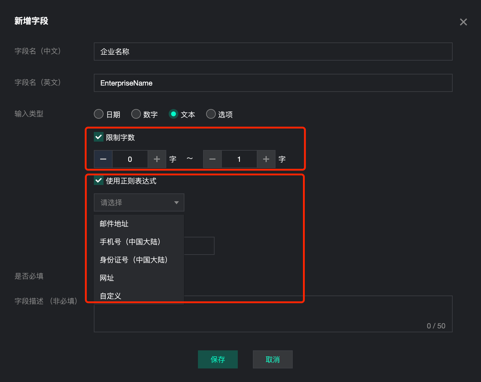 选择“文本”后,可进一步选择是否“限制字数”、是否“使用正则表达式”。如使用正则表达式,可直接选择“邮件地址”“身份证号”“手机号”“网址”等类型,也可选择“自定义”并手动输入正则表达式代码。