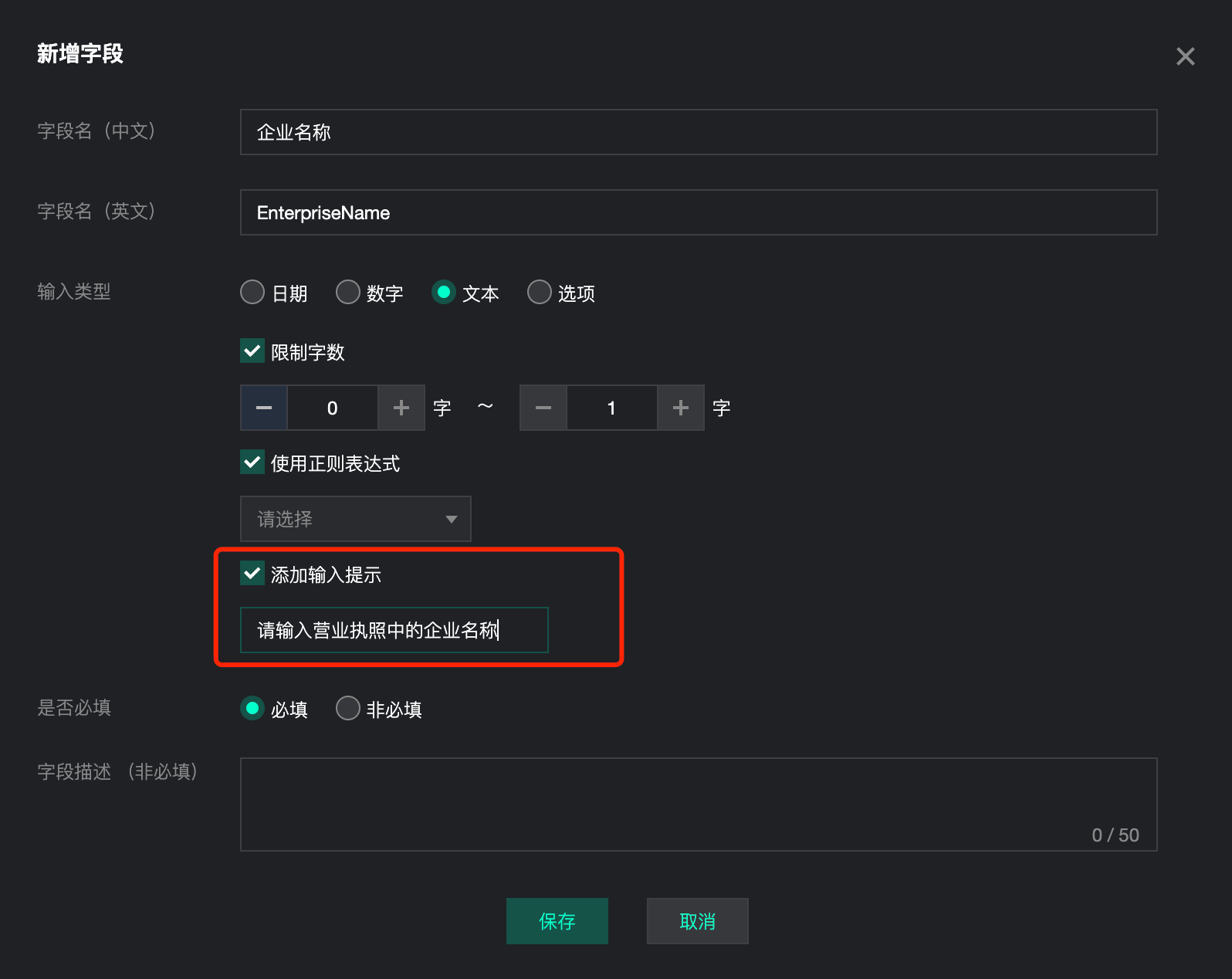 用户可以选择“添加输入提示”,帮助凭证的申请者在申请填写该模板时,进一步了解该字段需如何填写。