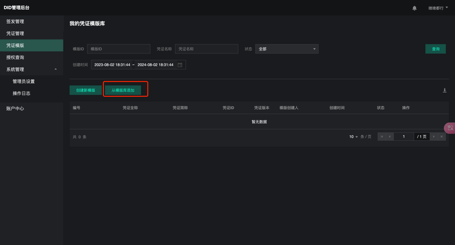 添加模板:用户可选择公共凭证模板库中其他用户创建的模板,直接“添加”至“我的凭证模板”。