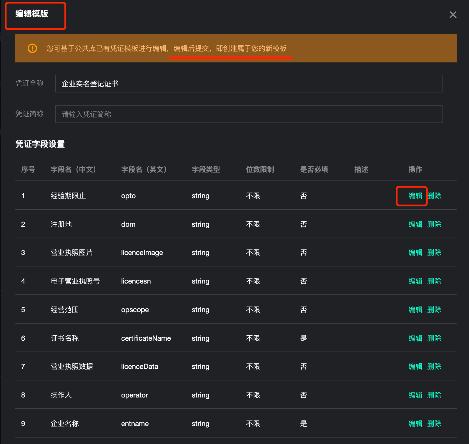| 编辑模板 | 可编辑、删除凭证模板已有字段或添加新字段,提交更新后将在原模板基础上生成新版本。 | ||