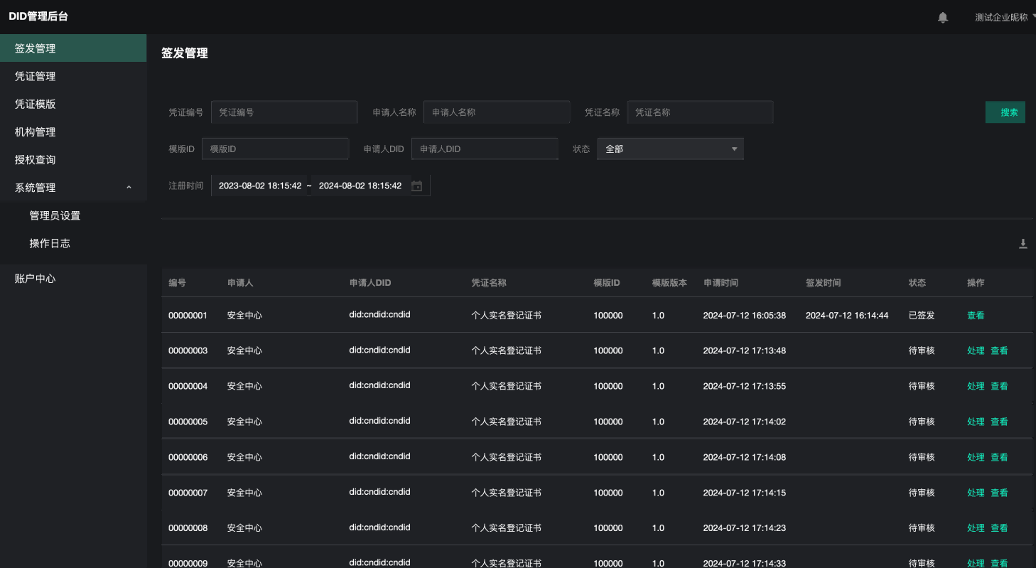 | 颁证机构审核(仅DID运营中心可使用) | 申请机构列表查询 | 支持企业名、审核时间搜索查询;支持按照申请状态——已通过、待审核、已驳回、已禁用进行筛选查询 | |