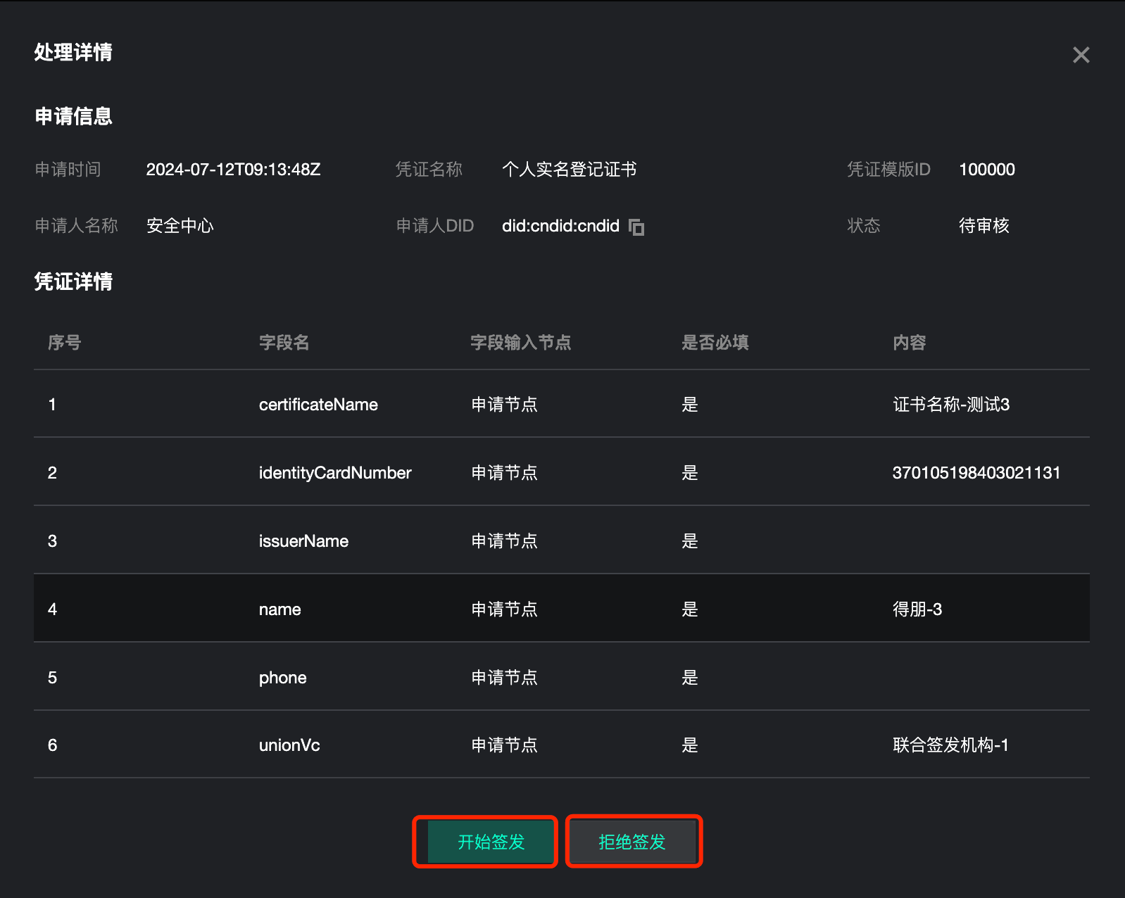 | 需审核凭证详情查看 | 查看VC凭证详情 | 对于需审核VC凭证中已签发或者已驳回的,可进行查看详情;包括查看申请时间、凭证名称、凭证模板号、申请人名称、申请人DID、签发状态、凭证字段详情、签发信息等。 | |