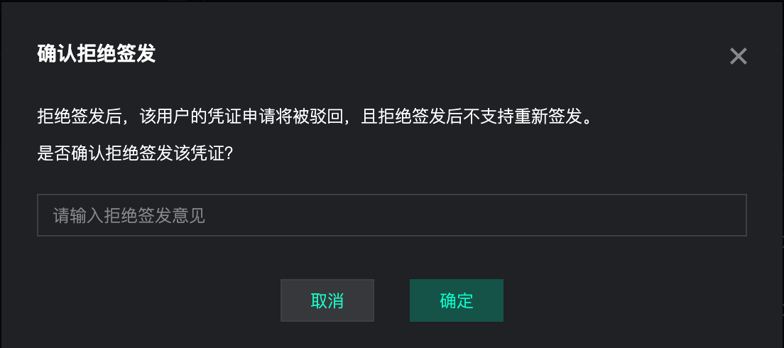 | 凭证审核签发 | 拒绝签发 | 可输入签发意见;拒绝后,VC凭证申请人该VC凭证状态变更为已驳回 | |