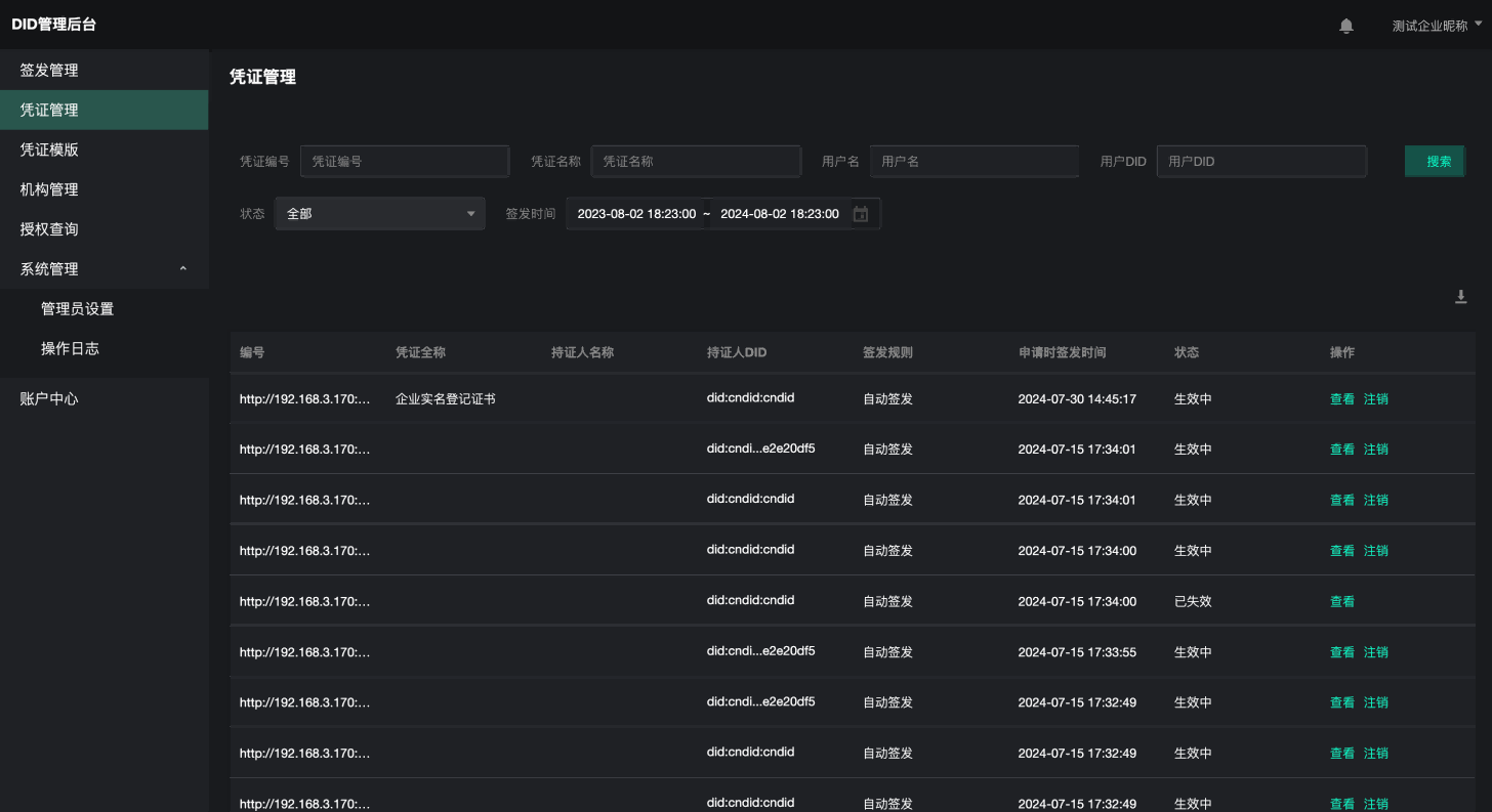 | 颁证机构VC凭证管理 | 已签发凭证列表查询 | 搜索 | 支持输入凭证编号、持证人名称、持证人DID、凭证名称、签发时间等搜索查询 |