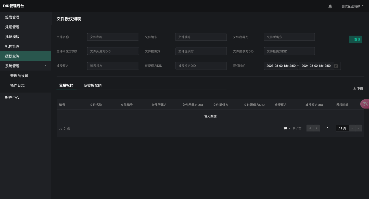 授权查询菜单中展示的为用户使用DID进行“授权文件”或“被授权文件”的操作记录。“授权查询”菜单为可选模块,用户在部署时可根据自身需求进行选择。提示:使用DID的文件授权服务,须另外部署“分布式文件共享服务管理台”。