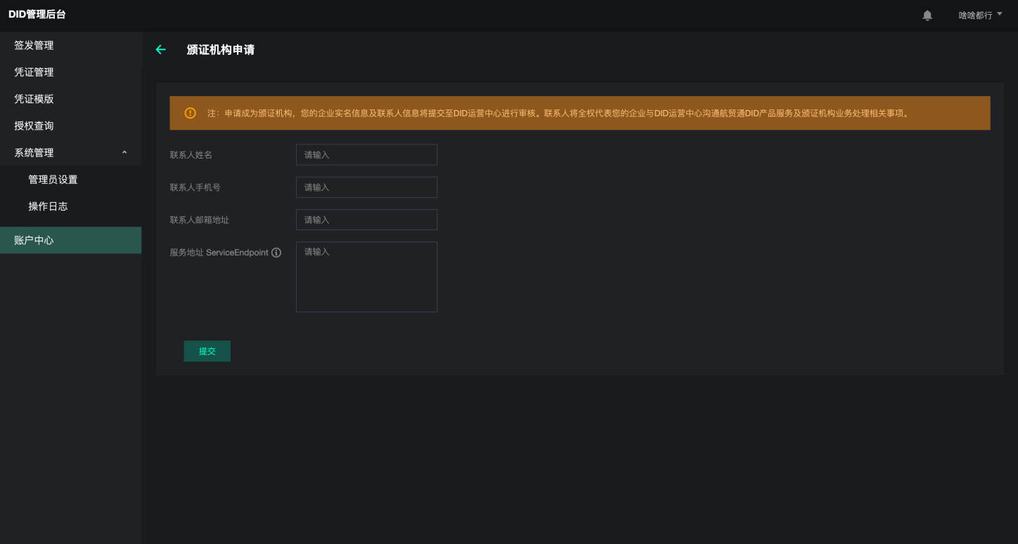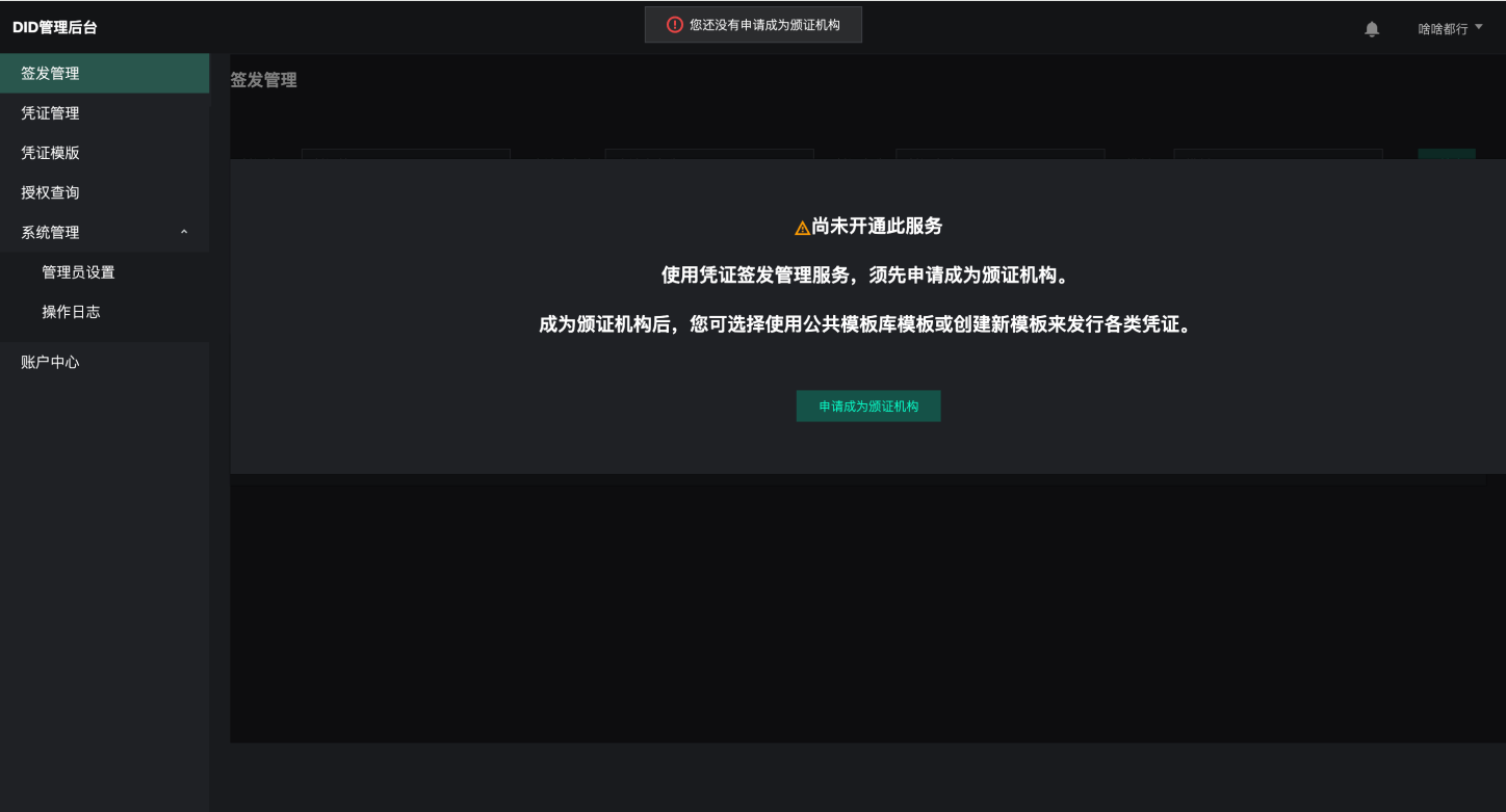 DID管理台用户须先完成“颁证机构申请”并审核通过后,方可使用颁证机构用户相关服务——签发管理、凭证管理、凭证模板。