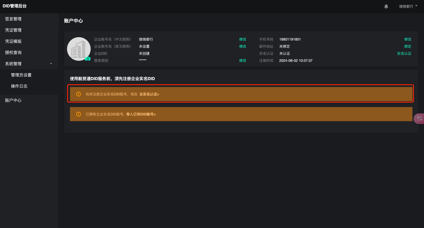 如用户此前未曾在航贸身份通DID服务相关产品(如航贸身份通APP、插件等)中注册过DID,须选择注册企业实名DID账号,进行实名认证。
