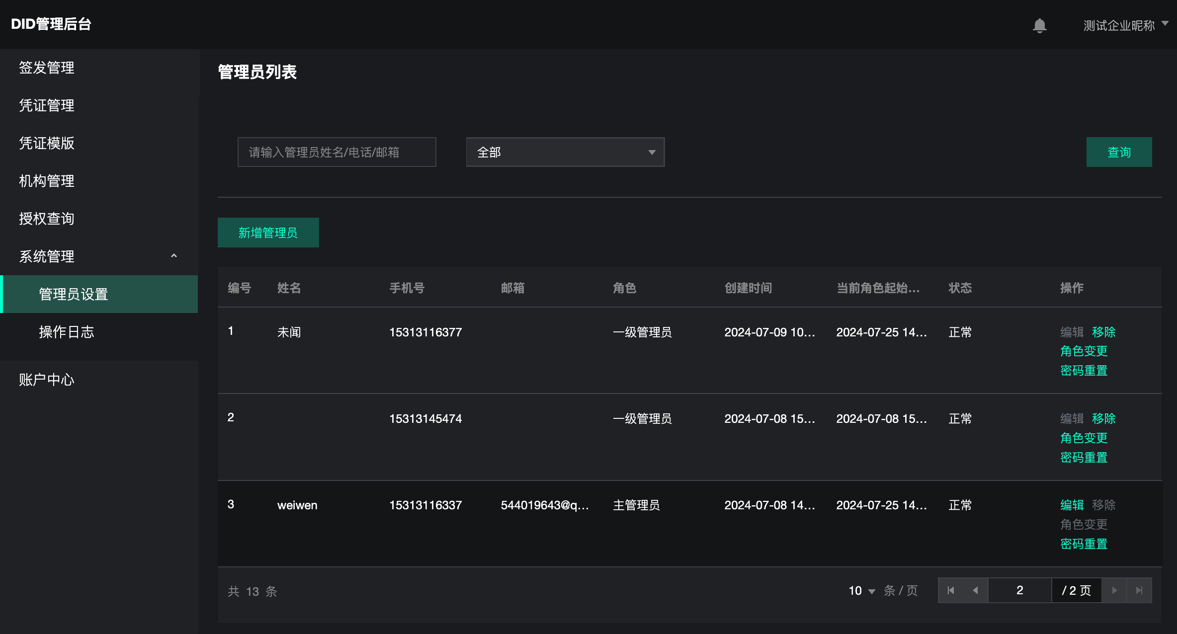 进入“管理员设置”可查看当前组织的“个人管理员”列表,并对列表中的管理员进行“编辑”“移除”“角色变更”“密码重置”等操作。