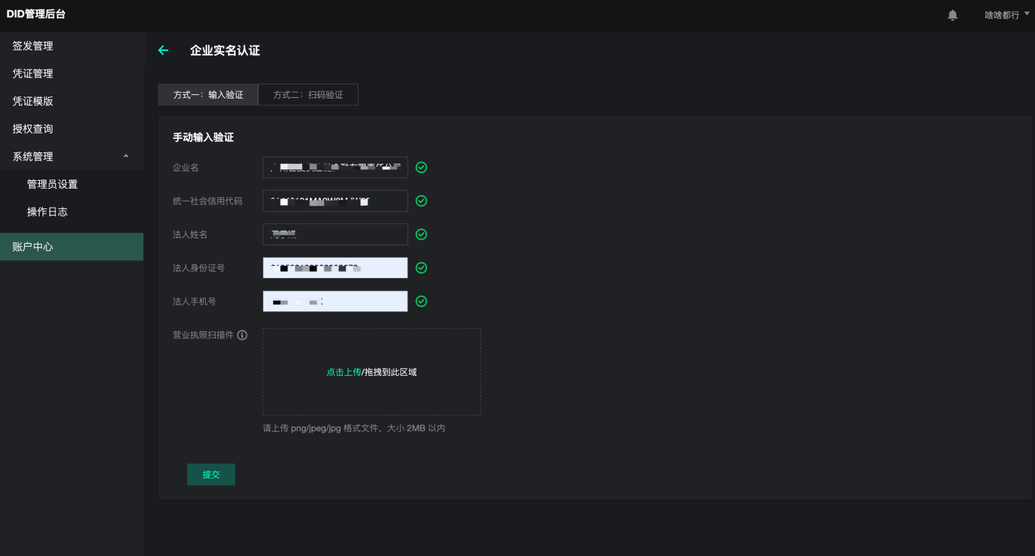 用户须手动输入企业名、社会信用代码等信息,并上传营业执照扫描件(图片格式)。点击提交后,该信息会传输至DID运营中心合作的企业实名认证服务商进行验证,验证通过则完成实名认证。