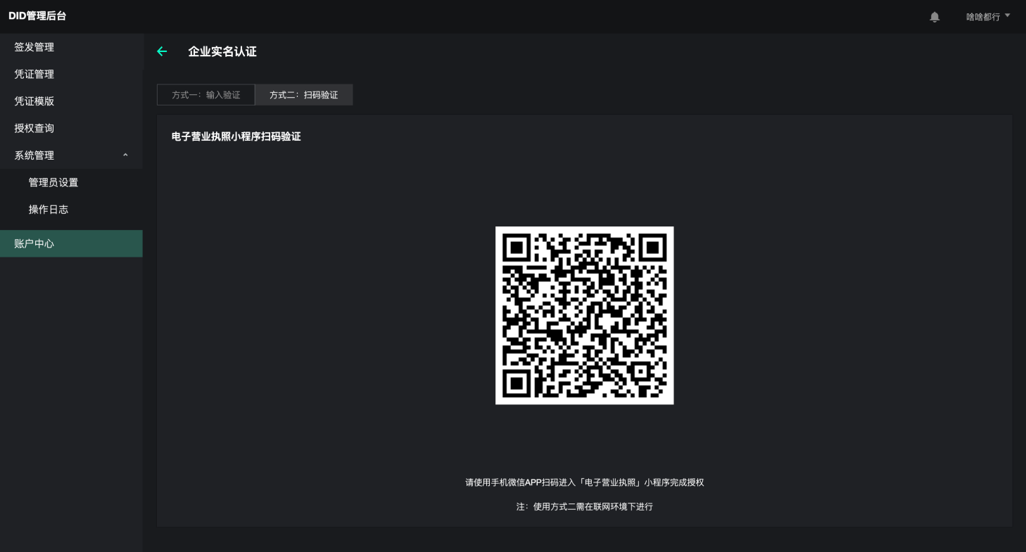 | DID账户管理 | 注册DID | 实名认证 | 提供手动输入实名验证方式及扫码进入电子营业执照小程序实名验证方式 |