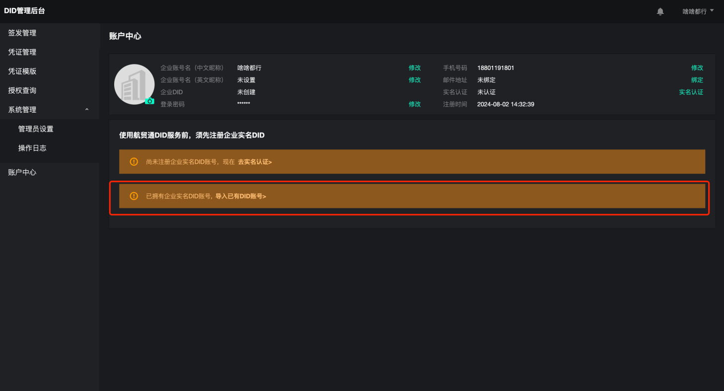 DID导入完成,即进入“账户中心-已实名状态”页面。