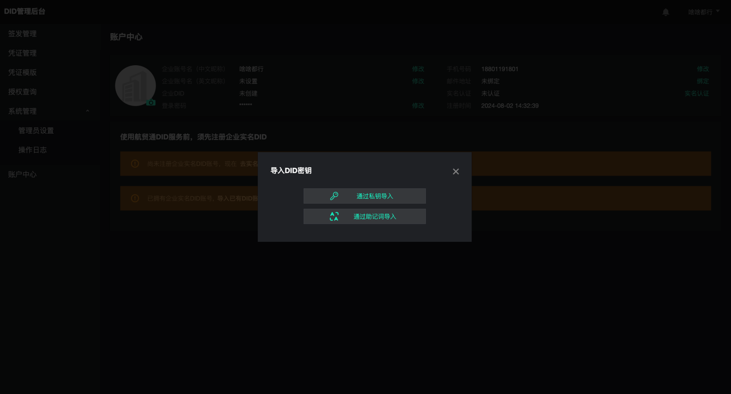 如用户此前已在航贸身份通DID服务中注册过实名DID,则可选择直接导入已有DID。