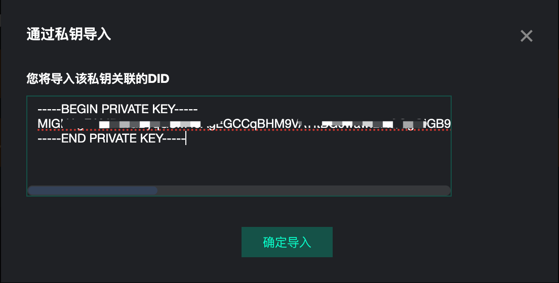 如用户需要使用自己已有的私钥创建公私钥密钥对和DID,可选择“导入已有私钥创建DID”。需要注意的是,由于DID服务不支持存在两个重复的私钥,如您的私钥已被占用,您将无法成功导入。